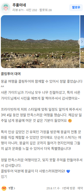 몽골 여행을 콜링투어와 함께할 수 있어서 정말 좋았습니다^^